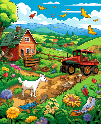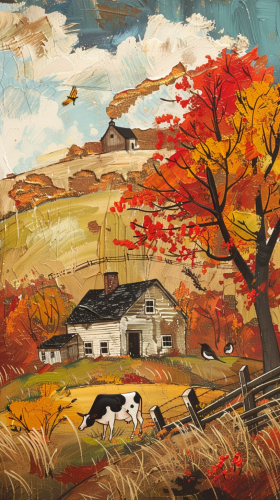 Picture bookIn the style of William Gropper, An enchanting scene on the farm, with a cute cow and a little bird happily munching on grain. The farm below is subtly illuminated with the golden and silver grass, and the colorful trees. --style raw --v 6.0 --ar 9:16