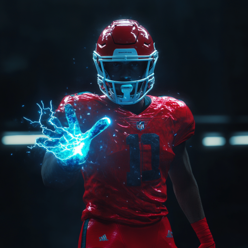 A 4k photorealistic photo of an American Football player wearing a red uniform, standing straight up, holding out his palm, and in his palm is a closed bottle of blue lightning. Dark and dramatic setting\