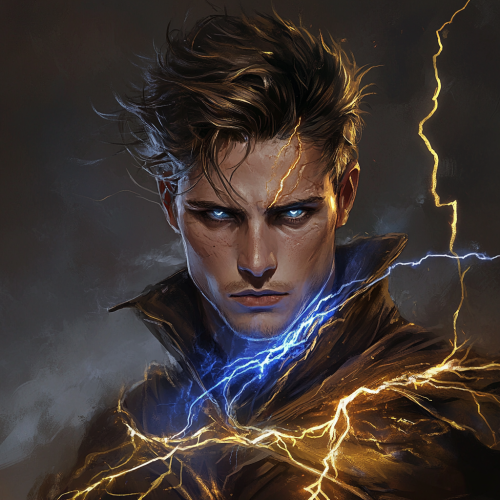 Chien dans un style semi-réaliste avec des pouvoirs de foudre, son pelage est d’un bleu sombre avec des motifs lumineux rappelant des éclairs. Ses yeux sont d’un éclat électrique, et des arcs électriques se forment autour de ses pattes et de sa queue. Le fond montre une scène dynamique avec un ciel orageux où des éclairs frappent le sol, créant une ambiance dramatique. 8K, highly detailed, --ar 9:16