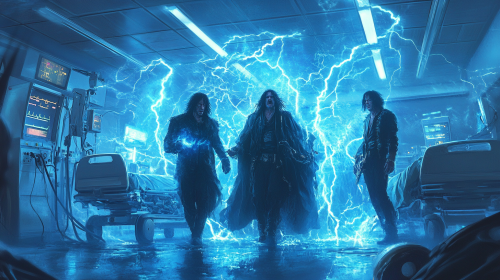 Nikki Sixx, Tommy Lee, Mick Mars, and Vince Neil standing triumphantly in a hospital emergency room, surrounded by blue lightning. This is a fantastical scene is depicted in the style of a fantasy art painting. --ar 16:9