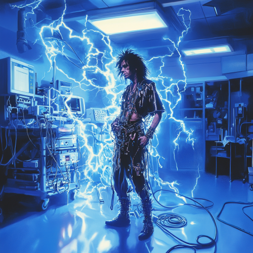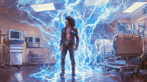 Nikki Sixx in 1989 standing triumphantly in a hospital emergency room, surrounded by blue lightning. This is a fantastical scene is depicted in the style of a fantasy art painting. --ar 16:9