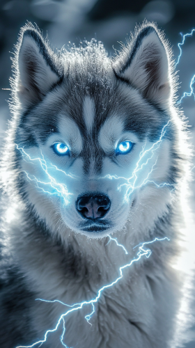 Chien Husky Sibérien avec des pouvoirs de foudre, son pelage est d'un blanc argenté avec des motifs d'éclairs bleus vibrants. Ses yeux sont d'un bleu clair et électrique, et des arcs d’électricité flottent autour de lui. Le fond est un paysage enneigé avec des éclairs traversant le ciel nocturne. 8K, highly detailed, --ar 9:16