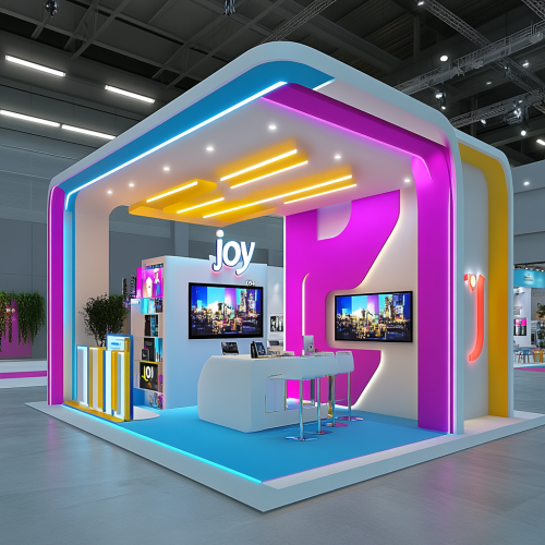 A 10x10 meters booth in an exhibition that should have the name: JOY. The booth theme should be characterized by a vibrant color palette, including fuchsia, blue, yellow, purple, and white, to enhance the visual impact and overall atmosphere. It should be very creative and nice. The booth should be big and wide enough with some interactve screens inside.