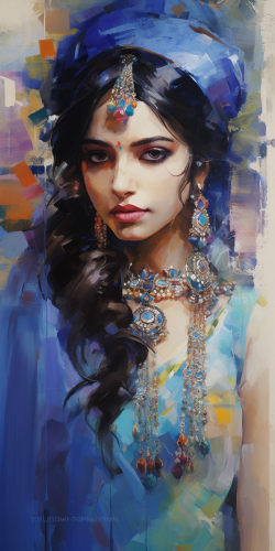 artistic painting of an indian girl wearing cultural clothes and jewellery, abstract india art, creative and unique art work, vibrant colors, blue and purple hues --ar 3:6