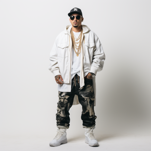 full body 90's rapper, brash, album cover photo, internet style wardrobe, stark white background --no background --v 5.2 --s 250