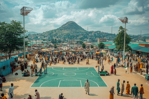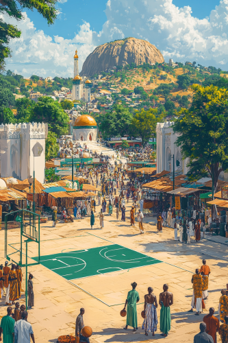 A wide, panoramic scene set in Abuja, Nigeria, showcasing the vibrant energy of the city. The foreground features a small half-court NBA-style basketball court with crisp green and white lines inspired by the Nigerian flag. Behind the court, locals dressed in traditional Yoruba Agbada, Igbo Isiagu, and Hausa Babanriga clothing are spread across the scene, shopping, playing drums, and interacting with one another. The scene stretches out to reveal a bustling marketplace and streets lined with modern Nigerian buildings such as the NNPC Towers and the Central Bank of Nigeria. Aso Rock towers in the distance, offering a natural backdrop to the vibrant city. The wide-angle perspective captures more depth, allowing the intricate details of both the cultural elements and the modern city to shine through. The midday sunlight illuminates the entire scene, casting natural shadows and enhancing the clarity and vibrancy of every element. --ar 3:2 --s 250 --v 6.1
