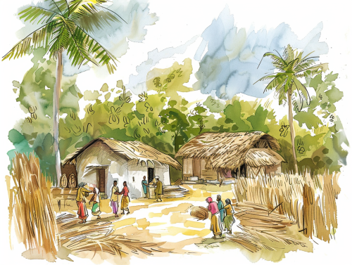 sketches of a Bangladeshi village scene, capturing the essence of rural life with people working in the fields and performing household chores. People are happy and celebrating life. First day of Bengali New Year. They are celebrating Nobanno festival. --ar 4:3 --v 6.0