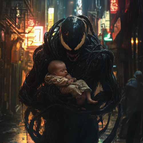 A female version of Venom, combining her monstrous appearance with a protective maternal instinct. Her symbiote form should include softer, flowing tendrils that cradle a baby safely, with a mix of terrifying strength and unexpected gentleness. The baby is wrapped in a black symbiotic blanket, with small tendrils forming playful shapes around it. The background is a dark, rainy alley in New York City at night, with neon signs flickering in the distance, casting eerie reflections on the wet pavement, adding to the mysterious and dangerous atmosphere.cinematic,high quality.