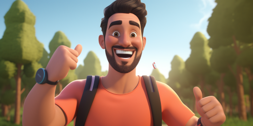 a 3D animated realism, happy guy being tracked by fitness trackers --ar 2:1