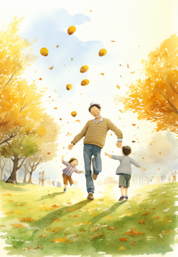 father playing with kids, children illustration book, watercolor style, in the style of nicholas hely hutchinson, alma woodsey thomas, sou fujimoto, school of london, pont-aven school, adventurecore --ar 9:13 --v 5.2