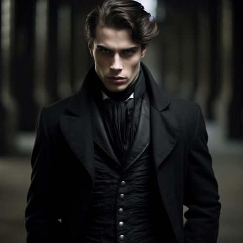 "Gothic minstril of Hawthorne's Lore" Style: Gothic horror in a photorealistic manner. Character Description: Origin: Inspired by male characters from a Nathaniel Hawthorne story. Age & Physique: A pale male in his mid-twenties. He should exude an aura of mysterious allure. His features are sharp, yet soft enough to appear approachable. Clothing: Period & Class: Middle-class clothing from the 1700s. Condition: The clothing should appear worn, bearing marks of time . However, it's evident that the wearer has done his best to maintain and repair them. Details: The attire is not noble but speaks of a person of importance, perhaps because of the wisdom he carries or the tales he can tell. The materials look aged, with faded colors and frayed edges, but the overall structure is sound. Layers of rustic garments, possibly a vest over a ruffled shirt, pants that have seen better days, and worn-out but sturdy shoes. Setting (optional): The backdrop could be a dimly lit entrance to an ancient mansion with gothic architectural elements, adding to the aura of timeless horror.