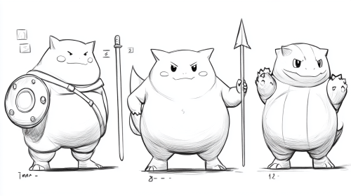 Vintage 1950s animation character sheet, sketch style, black and white line drawings, main character is a wapuu (a small Pokémon) with a shield, character depiction with exaggerated and menacing expressions and poses, labeled scene numbers, simple and stylized design, characters interacting and holding objects such as a shield and sword, nostalgic cartoon style