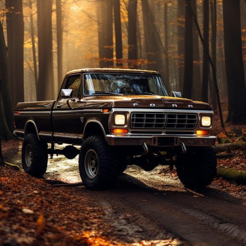 Create an ultra-realistic close-up shot of the front end (nose) of a beige Ford pickup truck as it comes to a stop beside the protagonist on a quiet, rural road. The truck’s nose shows signs of wear, with faint scratches, minor rust spots, and a layer of dust covering the front grille and bumper, giving it a rugged, well-used look. The beige paint is slightly faded, reflecting the vehicle’s age and long history of travel. In the foreground, the truck’s headlights and front grille are detailed, with subtle reflections on the metal surface. Beside the truck, the protagonist stands partially visible, dressed in his consistent attire: a dark red wool beanie, black hoodie, green backpack, and black mountain boots. His posture is calm, and he looks toward the vehicle with a composed, expectant expression. The soft, muted November light from the overcast sky adds a subdued atmosphere, casting gentle shadows on the truck and highlighting its rough texture, while capturing the stillness of the isolated setting. --ar 16:9
