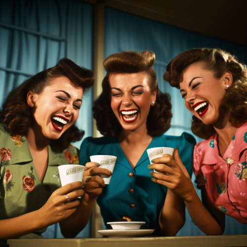 A 1950s-style advertisement featuring elegant women wearing genuine Apple AirPods in their ears, with a retro vintage aesthetic. The women are dressed in classic 1950s attire, with sophisticated hairstyles and timeless makeup. Soft pastel colors and a worn print texture evoke the era’s advertising style. --q 2