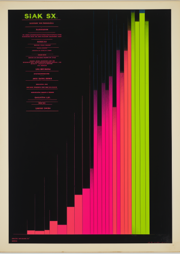 a scan of a 1960s minimalist print poster designed by Paula Scher, Carlos Cruz-Diez, and David Carson. It uses digital and physical mediums, like handwriting and stickers. The branding of the invitation is dark, neon, modern, and expiermntal. The color palette is black, hot pink gradients, green, and blue. --ar 5:7