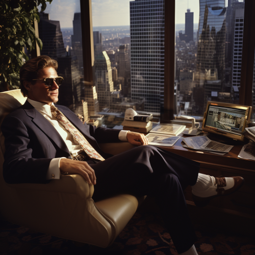 realistic high definition photograph of a 1980's stock broker living the high life in new york city