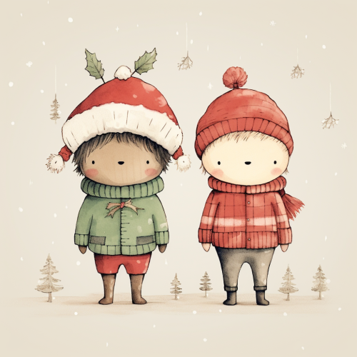 A vintage-style Christmas card featuring an illustration of Santa Claus, with a man with brown skin in the style of the artist Dark Pink and White, adorned with cute, cartoonish designs. The card also includes the captivating gaze of a Black woman's face, set against a light magenta background with a touch of sparkle. --ar 128:117