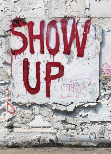 white distressed stucco wall with red graffiti that reads "SHOW UP", dystopian --ar 8:11 --v 6.0