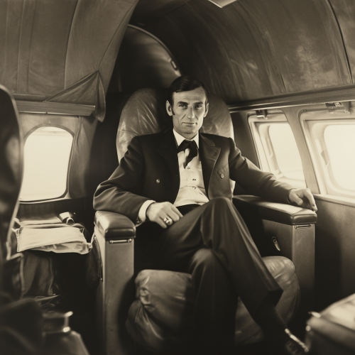 35mm 19th century black and white vintage still photo of Abraham Lincoln inside of a luxurious private jet.
