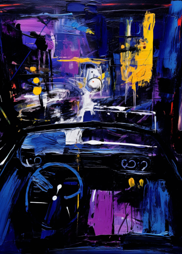a painting from the interior of a car dashboard raining, in the style of moody neo-expressionism, urban expressionism, dark blue and purple, moody color, pont-aven school, restrained expressionism, art brut --ar 23:32