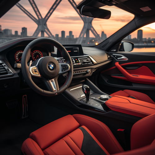 Detailed close-up of a car's interior focusing on the controls. The image should include the steering wheel with its buttons, gear shift, climate control dials, and infotainment system. Show each control clearly labeled and in a realistic setting within a modern car. Highlight the ergonomic design and functionality of the controls, with a focus on clarity and usability.