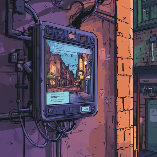color illustration of a touchable screen setting on a lab-vibe wall with wires and parts displaying picture of streetscape with big, clear words on top of the picture