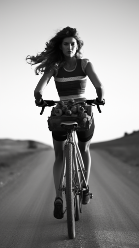 Black and white photography, low angle shot, shallow depth of field at golden hour, a lone young woman riding a 1890s Columbia Model 46 Woman's Safety Bicycle on an unpaved dirt road with handlebars facing the camera, shot on 1890s Lancaster B.B. Instantograph camera, historical, documentary, history of women's sports cycling, Annie Londonderry, aged film grain, vintage style, antique photograph --ar 9:16 --no people