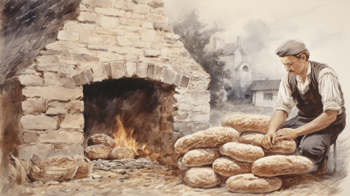 A vintage drawing of a traditional French baker preparing country bread with an old stone oven in the background and typical French countryside --ar 16:9