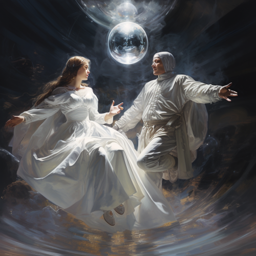 a man and a woman are floating in space above the earth. A man and a woman are connected by a light ball in the chest area, the light from the ball flows to the ground. the man is dressed in a hussar uniform, the woman is dressed in a long white dress with a hood.