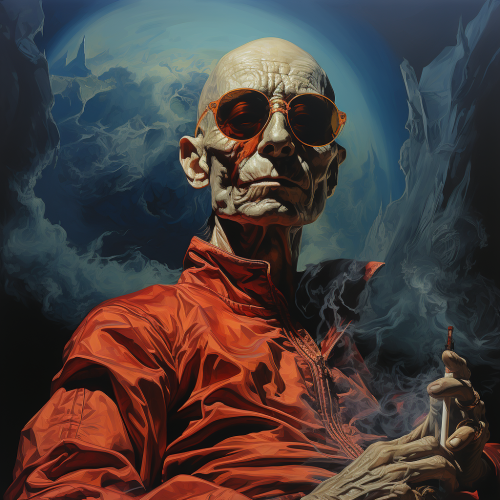 1970's dark fantasy book cover paper art dungeons and dragons style drawing of a humanoid smoking a pipe with minimalist far perspective --v 5.2 --s 750 --style raw