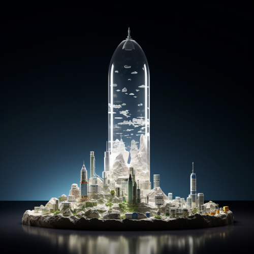 "Please generate a scene featuring a landscape with buildings towering like those of NASA's. Instead of a rocket, there is a PET bottle placed on the launchpad. The buildings should have a futuristic and modern design. The PET bottle is in a pre-launch state, undergoing inspections. The bottle is plain white and retains its original bottle design, reflecting the elements of the commercial. The sky is clear, with a wide expanse of blue."