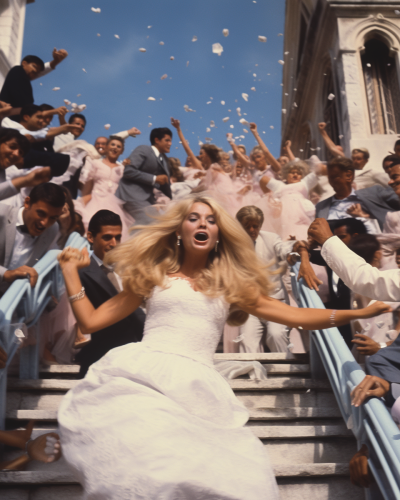 hyper-realistic photography of Brigitte Bardot and her new husband dancing out of the french cathedral right after their wedding in the french riviera in the 1960s, they are so happy, standing on the stairs, guests are throwing rice at them, vail is blowing in the wind, minidress, high fashion, wealth and fame, party images, vogue, documentary style, wedding photography, summer, soft light, hazy, style as shot with kodak ultra 200 color film, film grain, happy people, rich and famous, haut couture, champagne and glitter --ar 4:5 --chaos 10 --style raw