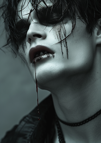 fashion photography, close-up of a male vampire, his eyes are closed and fangs showing, hot sauce drips from his mouth, --style raw --s 250 --ar 5:7 --v 6.0