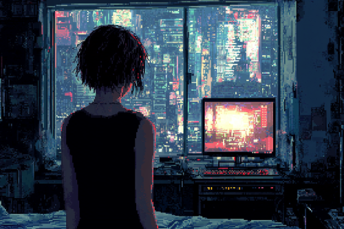 pixel art, game art, 8 bit, bedroom scene, tired woman with short brown hair getting home, messy bed in the background, desktop computer lit up in the corner, light coming through a large window with a cityscape, neon red and blue colors, film noir inspired --ar 3:2 --v 6.1