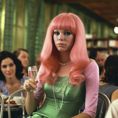 woman with long pink hair, at a formal party, long green dress, 1960s style, 60s, movie scene, --v 5.1