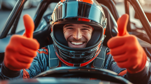 create a photo of a racecar driver with helmet and driving gear sitting in his car putting both thumbs up, big excited smile, hyperrealistic and bright --quality 2 --ar 16:9
