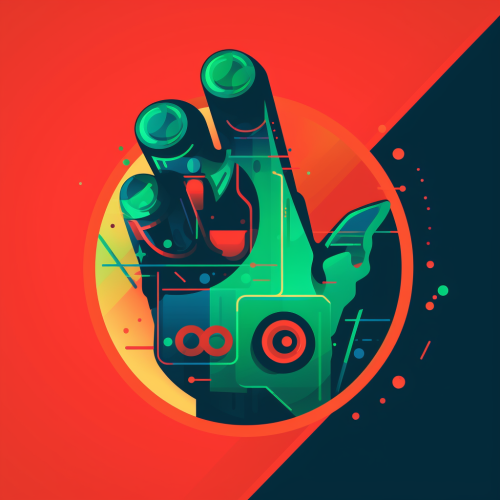 0xBot logo featuring a robotic hand reaching out towards a target marked '100x+', the '0x' symbol creatively incorporated, using a color palette of red and green to symbolize focus and ambition, graphic design, dynamic vector art, --ar 1:1 --v 5.0