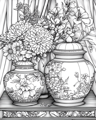 Create a black and white coloring page illustration of an arrangement of vintage glass candy jars. A floral arrangement of chrysanthemums and iris and cherry blossom branches and roses and peonies and small filler flowers and foliage are arranged in a Chinese vase next to these candy jars. The vase and glass candy jars sit on a beautiful Victorian style display table in a drawing room. A Japanese vintage Geisha Doll on a wooden pedestal stand. There are drapes in the background. The lines are thick and no shading or shadows on this illustration. --ar 4:5 --v 6.1 --stylize 300