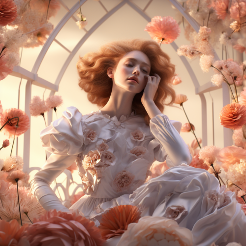 Fashion photography, soft sunlight, C4D model, OC rendering, desktop, silk, surrounded by flowers