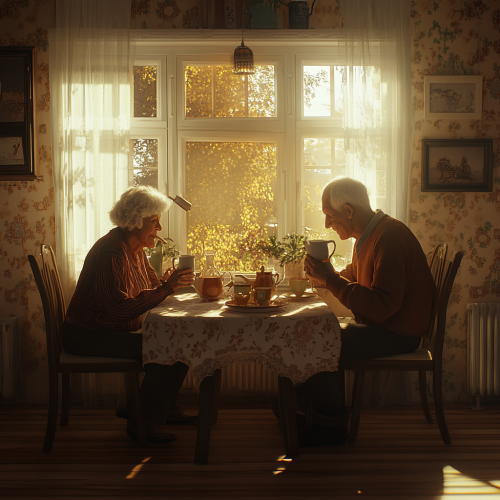 an old woman and an old man sitting around a table, sipping tea. They are in a 1970s nostalgic house. warm sunlight shines through the windows, photorealistic, 4k ar 16:9