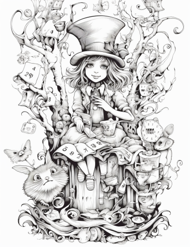 Alice in a garden of fantastical flowers, the Cheshire Cat in a tree, and the Mad Hatter's tea party in full swing, black and white coloring page, intricate details, vectorized clear images, thin lines, no shadows, --ar 85:110