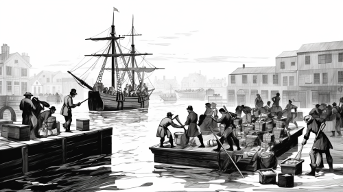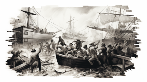 boston tea party scene with people throwing crates of tea from the dock into the water. illustration. black and white. --ar 16:9 --style raw