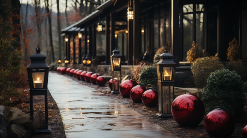 Outdoor garden. Decorated for Christmas party. Classic styling. Vaporwave. Elegant. Christmas trees. Asheville North Carolina. Cinematic. Mountains. Cobblestone path. Bakeh. Blurred background. Extreme low angle camera angle. Extreme blue skies. Warm White lights. Golden hour. High - end. Stylish. Important. Mysterious. Black and white.Very minimalist. Red color splash. Clean lines. Shot with a Pentax. K - 3 III Monochrome. --ar 16:9 --q 0.5 --s 750