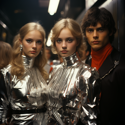 **Step into a virtual realm where fashion transcends reality and embraces a holographic future. Designers are challenged to create stunning holographic garments that embody afrofuturism, blending vibrant colors, holographic textures, and futuristic patterns. Encourage the use of innovative techniques, such as holographic fabric manipulation, light projections, and interactive elements that captivate the audience in this digital fashion show experience, beautiful women , handsome men, runway fashionshow scenery , fullbody view of affits, Fashionable shoes v:51