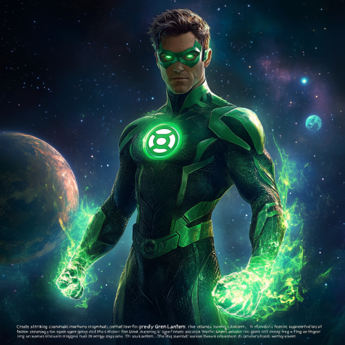 "Create a striking, cinematic image in a 16:9 format featuring a powerful superhero inspired by Green Lantern. He stands confidently in space, wearing his iconic green and black suit that glows with energy from the Green Lantern ring on his finger. The suit has sleek, futuristic details, with the Green Lantern emblem shining brightly on his chest. In his outstretched hand, he holds a massive, glowing construct formed by the ring's power--an enormous, translucent green shield or weapon. Surrounding him are distant stars and galaxies, with the faint glow of planets in the background. His posture is heroic and determined, exuding the strength and willpower that fuels his abilities. A vibrant green aura surrounds him, symbolizing the immense energy he channels from the ring as the guardian of the universe."