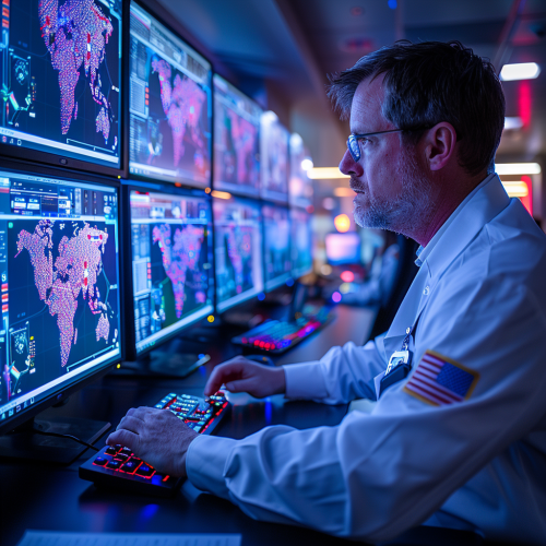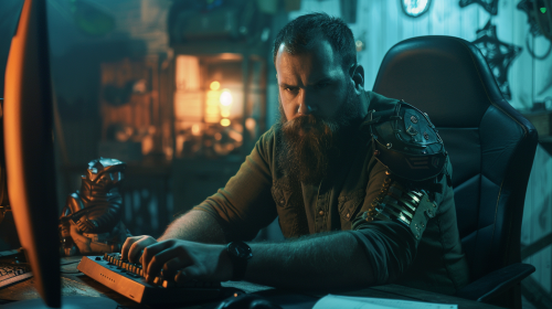 bearded man on his computer with a shield in his hands 4K realistic --ar 16:9 --v 6.0