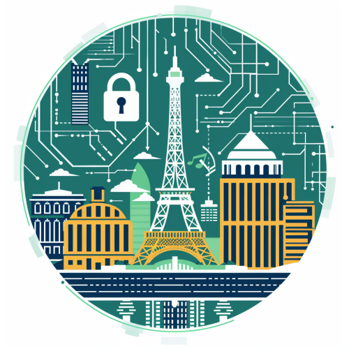 square sticker with exact square corners for the 'CyberTaskForce at AWS' event, ensuring a crisp, clear boundary. Incorporate iconic landmarks such as the Eiffel Tower and the Capitol building to represent Paris and Washington, respectively. Add cybersecurity symbols, like a digital lock or shield. The 'AWS' logo should be distinctly prominent and legible, contrasting sharply against a white background, with 'CyberTaskForce' also prominently displayed. The overall design should be modern, professional, and tailored for a high-tech, security-focused event. --v 6.0