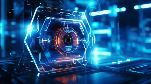 Create a zoom out highly detailed and hyper-realistic visualization of a cybersecurity concept. Show a futuristic, glowing shield with a padlock in the center, representing data protection. The shield is integrated into a digital circuit board, surrounded by intricate, glowing blue and neon-lit circuit lines and electronic components. --ar 3:2 --v 6.1
