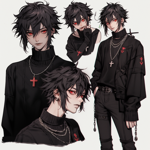 detailed character reference sheet, A man, vampire, short black curly hair, red eyes, tight shorts, oversized black sweater, fishnets, A black choker, expressive, ultra-detailed, male, anime key visual, moody, korean manhua style --niji 5