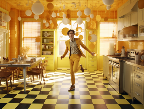 Vogue photoshoot of a glamorous kitchen with a man running in it, in wes anderson style, yellow theme, natural sunlight, surreal, detailed facial expressions --ar 4:3 --v 5.1 --s 250